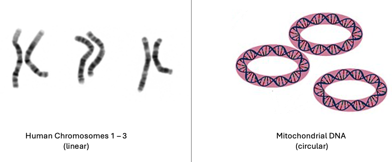 Figure 1. Left: Chromosomes 1 - 3 of a human karyotype illustrating linear chromosomes. Right: A depiction of mitochondrial DNA illustrating circular chromosomes. Image source: National Human Genome Research Institute, Public domain, via Wikimedia Commons. Science Primer (National Center for Biotechnology Information). Vectorized by Mortadelo2005., Public domain, via Wikimedia Commons. Edited by author.