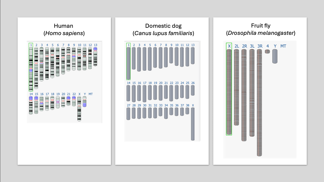 Figure 4. Idoegrams of Human, Domestic dog, and Fruit fly chromosomes types. Source: National Center for Biotechnology Information Genome Data Viewer.
