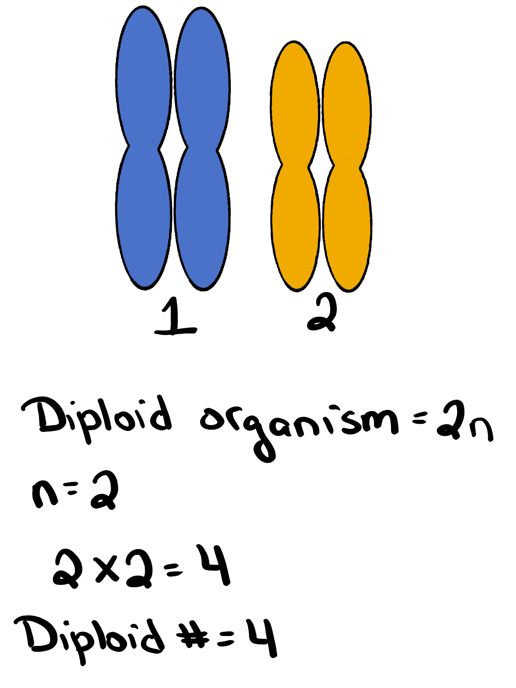Pretend a diploid organism has two chromosome types (chromosome 1 and 2). With this information we know: