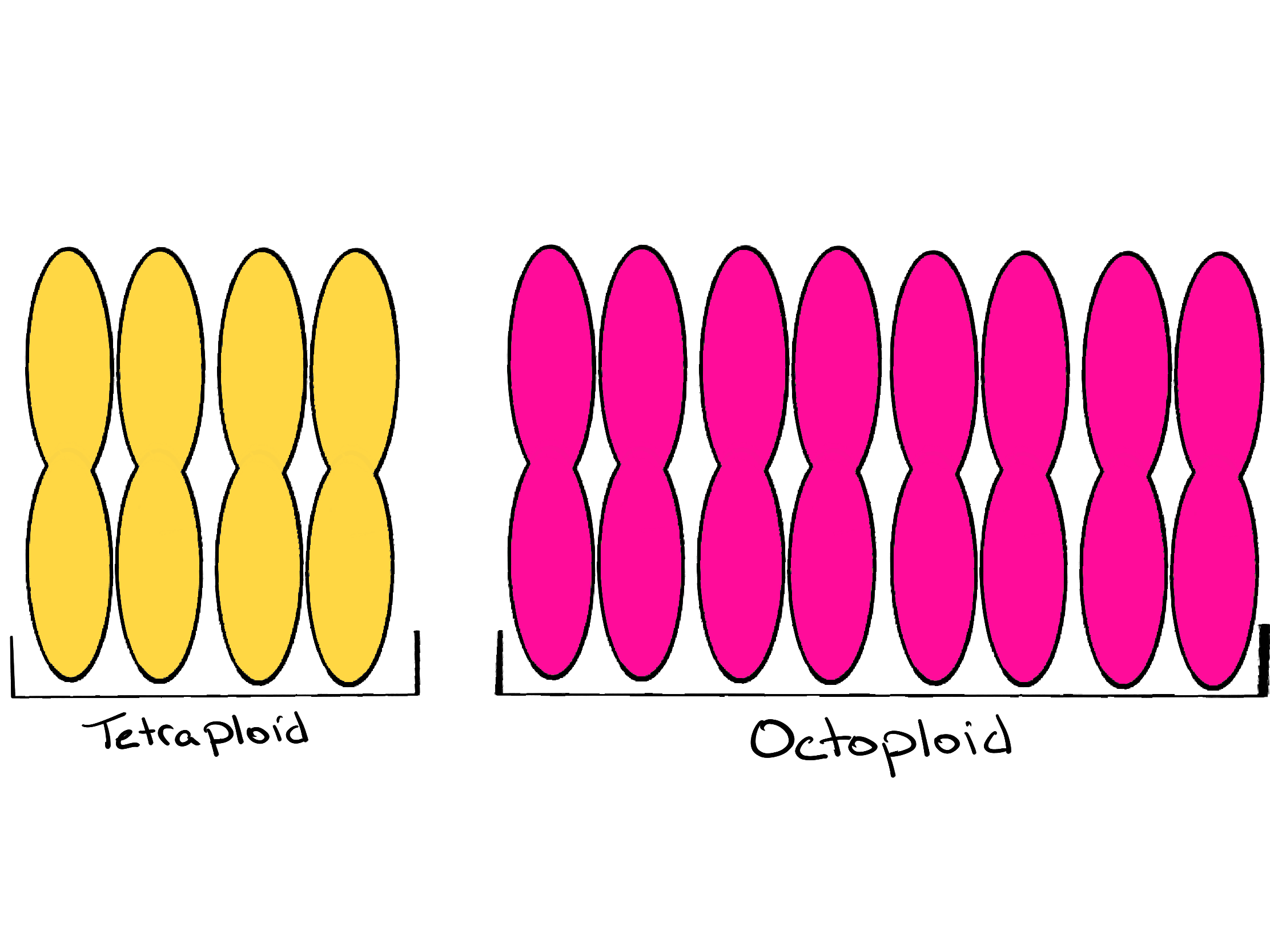 Figure 2: Two examples of polyploidy. One complete set of homologous chromosomes in a tetraploid organism and an octoploid organism.